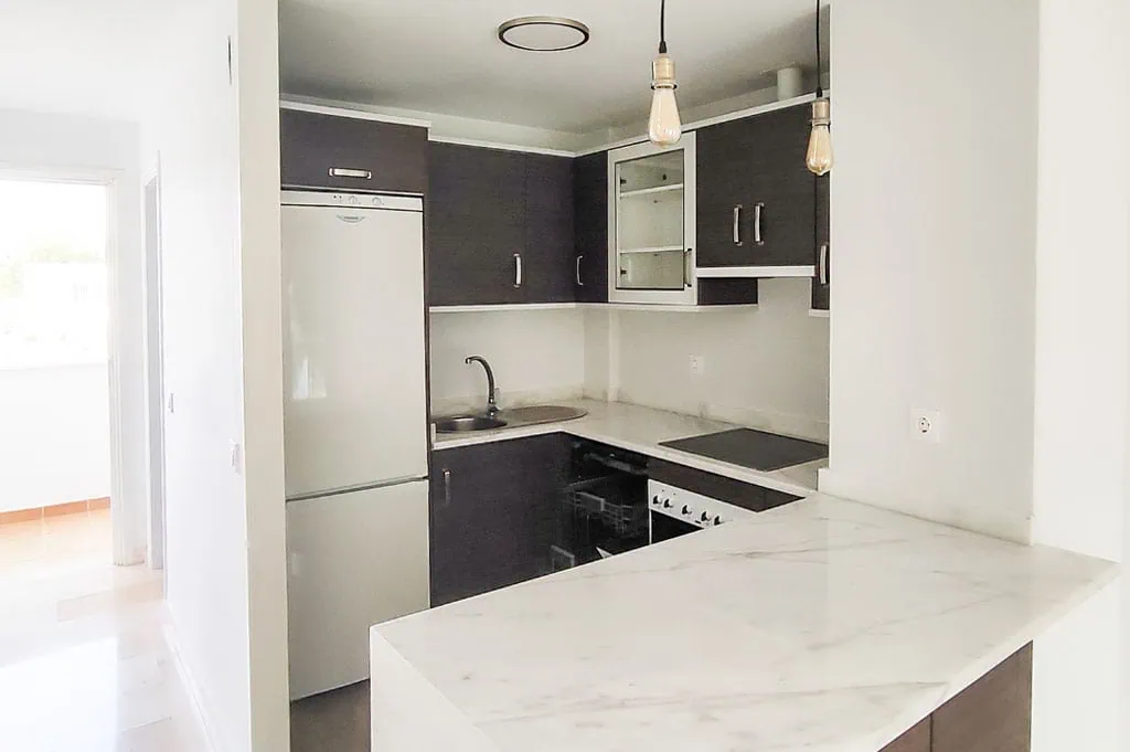 Interiores Modernos Accede desde el pasillo a una cocina funcional y equipada con electrodomésticos de alta calidad. La isla central de mármol conecta la cocina con el comedor, creando un espacio contemporáneo y elegante.